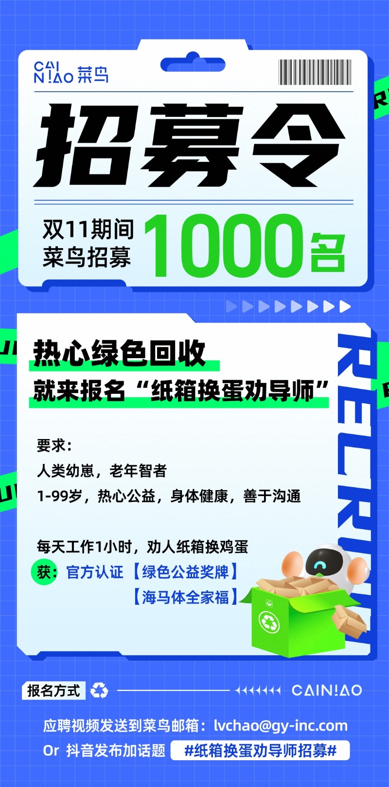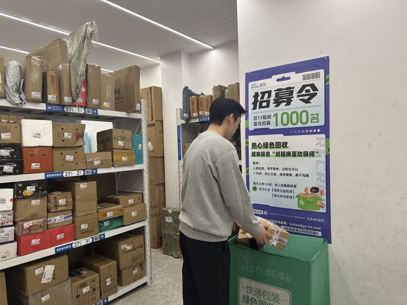 11月1日起,菜鳥在全國啟動(dòng)“紙箱換蛋勸導(dǎo)師”招募,計(jì)劃招募千名志愿者,負(fù)責(zé)在菜鳥驛站協(xié)助消費(fèi)者參與“快遞包裝回收換蛋”,引導(dǎo)消費(fèi)者參與綠色物流。