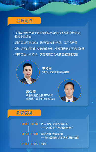 會中,來自SAP中國的資深解決方案架構師李枝國,以及來自建廣數(shù)科的裝備制造行業(yè)資深架構師孟令德,分別為來賓分享了SAP數(shù)字平臺和智能技術應用,以及復雜裝備制造下的多項目管理等,與企業(yè)業(yè)務發(fā)展緊密相關的信息化議題。幫助企業(yè)了解如何利用基于SAP云的集成式制造執(zhí)行系統(tǒng)和分析系統(tǒng),提高制造績效;洞察工業(yè)可持續(xù)性,打造更環(huán)保的制造流程、工廠和產(chǎn)品;端到端的多項目管理,實現(xiàn)戰(zhàn)略到項目的成功落地;減少運營過程和供應鏈的碳排放,實現(xiàn)盈利性的可持續(xù)發(fā)展;以及利用工業(yè)4.0技術,實現(xiàn)高度自動化的智能制造流程等前沿觀點,為企業(yè)的數(shù)字化建設提供了有效的思路與建議。