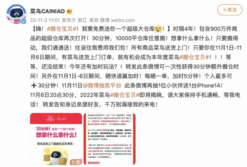 時(shí)隔四年,菜鳥再次尋找“搬倉寶貝”,今日在官方賬號(hào)發(fā)布消息稱,將在菜鳥送貨上門的包裹中尋找“搬倉寶貝”,這位幸運(yùn)兒將有機(jī)會(huì)來到天貓超市的倉庫,30分鐘,900萬件商品一次搬齊,只要拿得動(dòng),想拿什么拿什么!