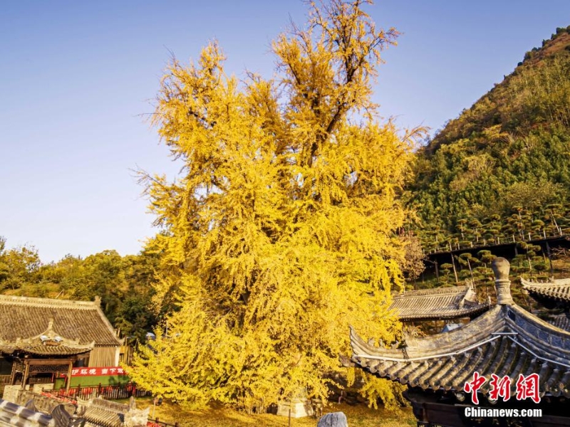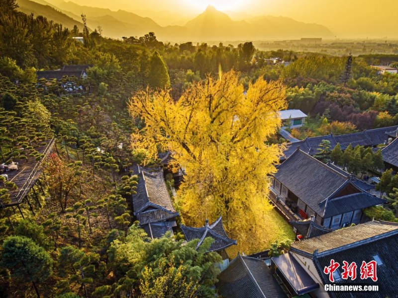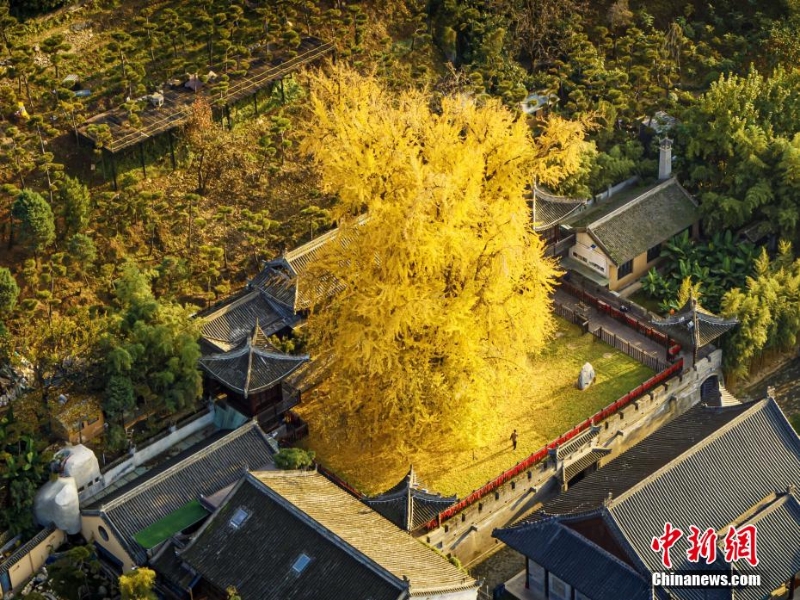 11月,西安古觀音禪寺里的千年銀杏樹又迎來了自己的“閃亮?xí)r刻”。高數(shù)十米的銀杏樹,樹葉泛黃,落葉繽紛。遠遠望去,仿佛是山間噴涌而出的一股金色噴泉。如此美景,令觀者陶醉。劉夙培 攝
