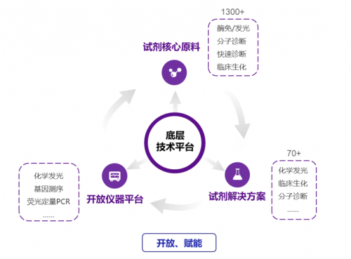 但菲鵬生物本質(zhì)上還是屬于產(chǎn)業(yè)鏈上游,其核心生物活性原料菲鵬生物發(fā)展之根,而試劑解決方案主要是向IVD的中游廠商提供試劑半成品,讓中游試劑廠商能夠更專注于試劑開發(fā)、市場(chǎng)拓展,是行業(yè)成熟分工化的重要體現(xiàn)。菲鵬生物的創(chuàng)新儀器平臺(tái),旨在在一個(gè)截然不同的“開放式生態(tài)”,以開放運(yùn)營(yíng)的模式聯(lián)結(jié)上游開發(fā)者與下游應(yīng)用者,滿足各個(gè)IVD公司和終端客戶的不同需求。