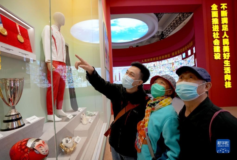 11月4日,來自北京西城區(qū)的李抗美(右)、王昭慧(中)老兩口與兒子一起觀看有關(guān)北京冬奧會的展出實物。為能盡快參觀“奮進新時代”主題成就展,老兩口讓兒子10月31日零點就上線登記預(yù)約。