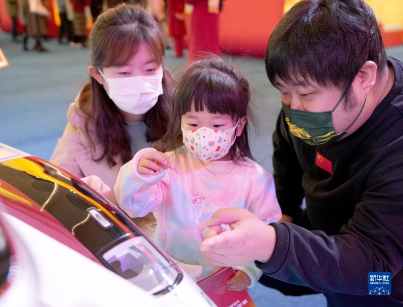 11月4日,年僅2歲半的小觀眾楊紫凝(中)與父母一起觀看展覽展出的動車組模型。