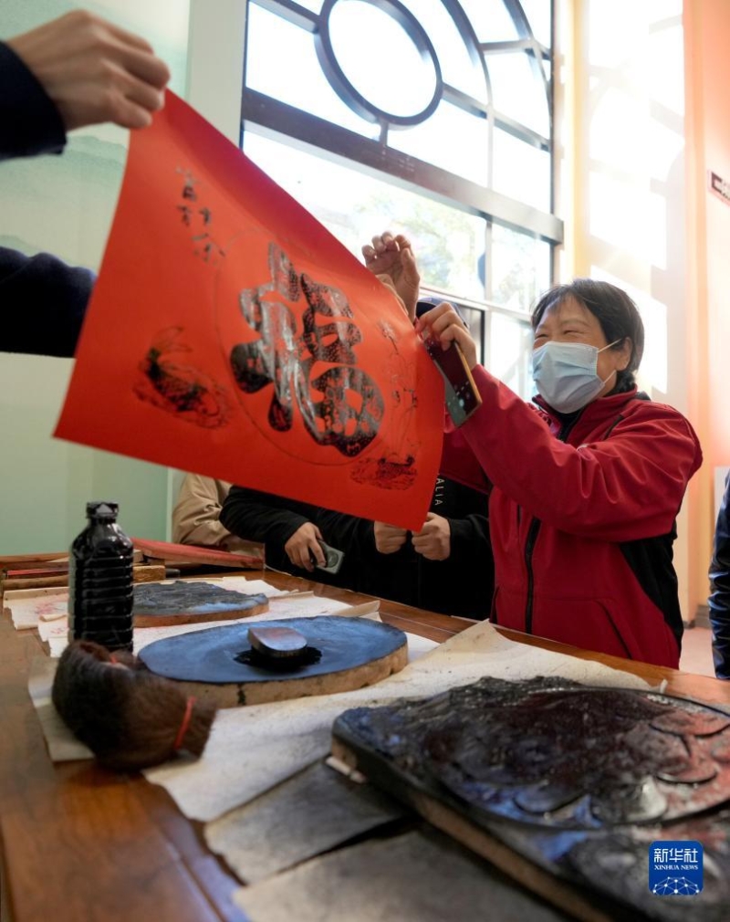 11月4日,來自北京海淀區(qū)的王尚敏(右)在參觀展覽中的“雕版印刷”演示時,得到工作人員贈送的福字。