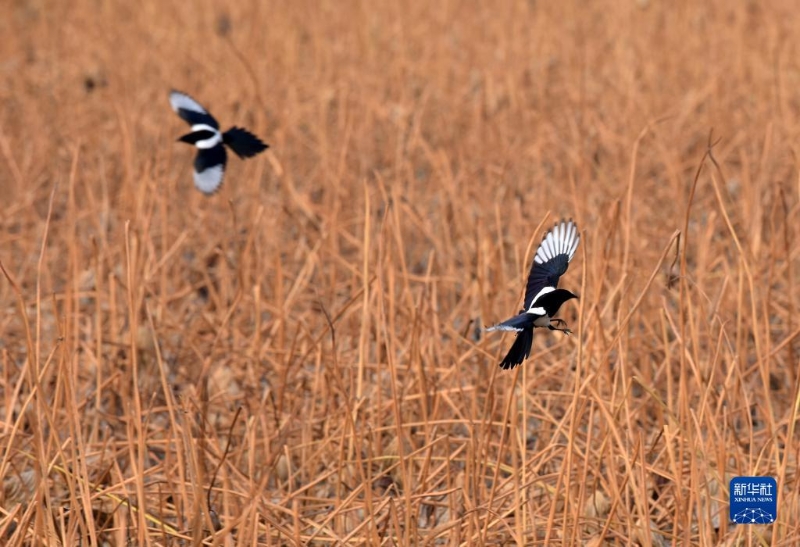 11月5日,喜鵲在安徽巢湖半島國家濕地公園內(nèi)飛翔。