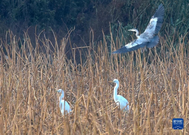 11月5日在安徽巢湖半島國家濕地公園內(nèi)拍攝的白鷺(下)和蒼鷺。