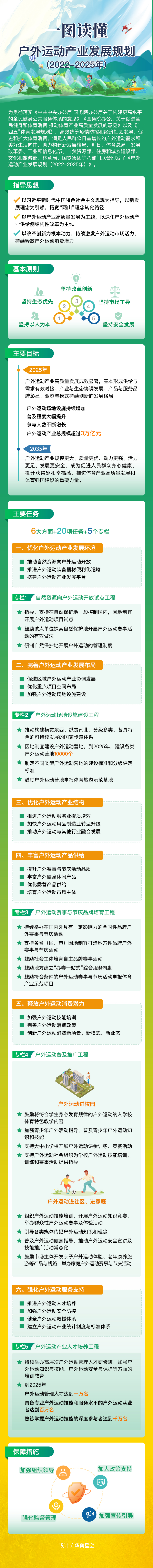《規(guī)劃》提出,到2025年,戶外運動產(chǎn)業(yè)高質(zhì)量發(fā)展成效顯著,基本形成供給與需求有效對接、產(chǎn)業(yè)與生態(tài)協(xié)調(diào)發(fā)展、產(chǎn)品與服務(wù)品牌彰顯、業(yè)態(tài)與模式持續(xù)創(chuàng)新的發(fā)展格局。戶外運動場地設(shè)施持續(xù)增加,普及程度大幅提升,參與人數(shù)不斷增長,戶外運動產(chǎn)業(yè)總規(guī)模超過3萬億元。到2035年,戶外運動產(chǎn)業(yè)規(guī)模更大、質(zhì)量更優(yōu)、動力更強、活力更足、發(fā)展更安全,成為促進人民群眾身心健康、提升獲得感和幸福感、推進體育產(chǎn)業(yè)高質(zhì)量發(fā)展和體育強國建設(shè)的重要力量。