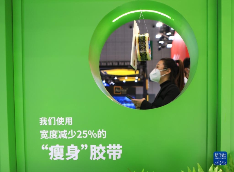 11月7日在第五屆進博會服務貿易展區(qū)拍攝的快遞運輸企業(yè)環(huán)保用材展示。
