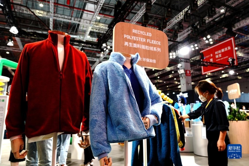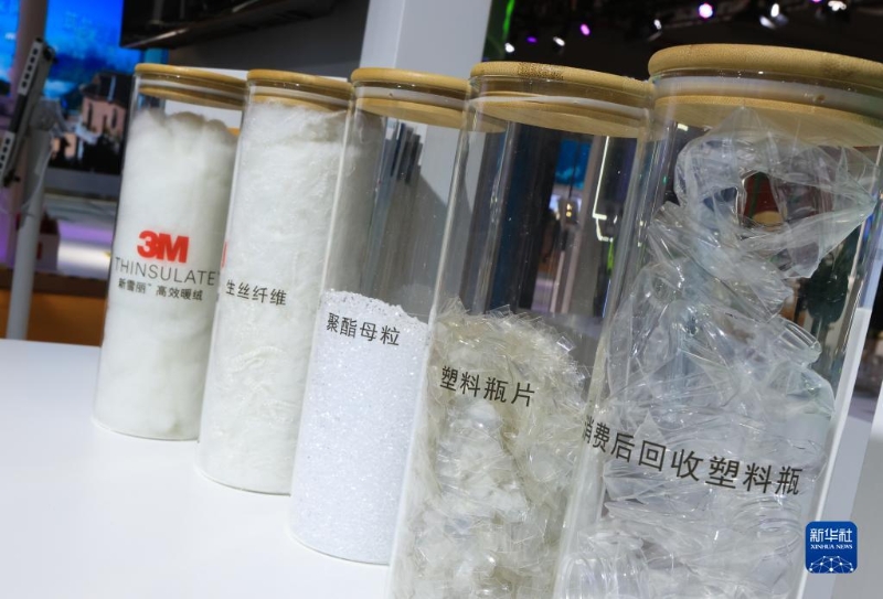 11月7日,優(yōu)衣庫參展人員在第五屆進博會上介紹參展的環(huán)保服裝,該服裝面料采用源自回收塑料瓶的再生聚酯纖維。