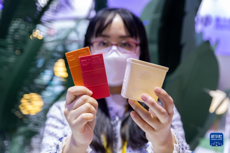 11月7日,工作人員在第五屆進博會上展示創(chuàng)新纖維素生物基材“BBC纖維絮紙”。