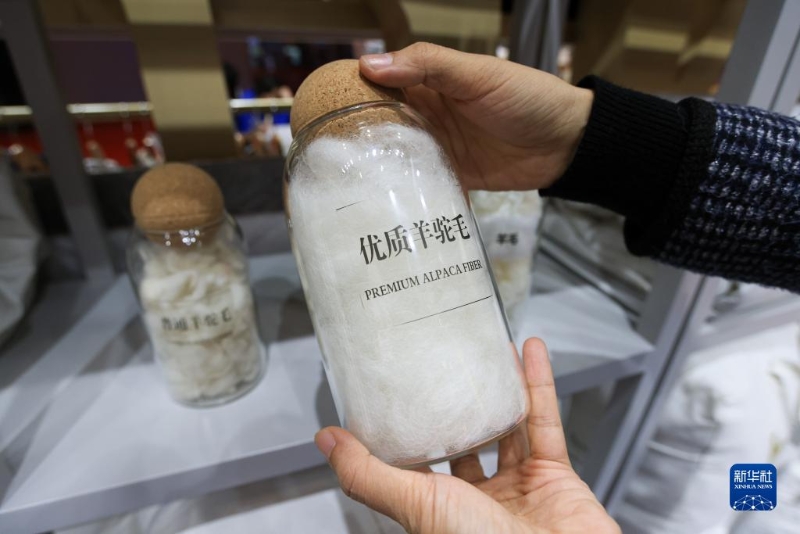 11月7日,在第五屆進(jìn)博會(huì)上,新西蘭太平洋羊駝集團(tuán)公司工作人員在展臺(tái)介紹優(yōu)質(zhì)羊駝毛。