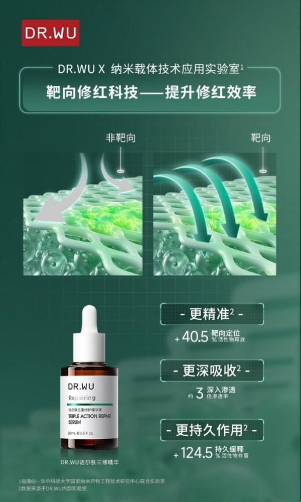 此外,今年年初,逸仙電商旗下品牌DR.WU達爾膚在納米輸送技術的基礎上,更進一步提出靶向精準起效的新方向。經過聯合實驗室深入研究和嚴苛驗證,新一代靶向納米載體技術自此誕生,靶向修紅科技和專研成分“膚源修TransHealer”成功應用于達爾膚產品中。
