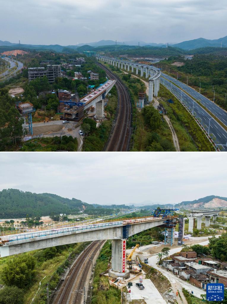拼版照片:清遠(yuǎn)磁浮旅游專線長(zhǎng)隆特大橋跨京廣鐵路連續(xù)梁轉(zhuǎn)體前后的對(duì)比(上圖攝于11月7日,下圖攝于11月8日,無(wú)人機(jī)照片)。