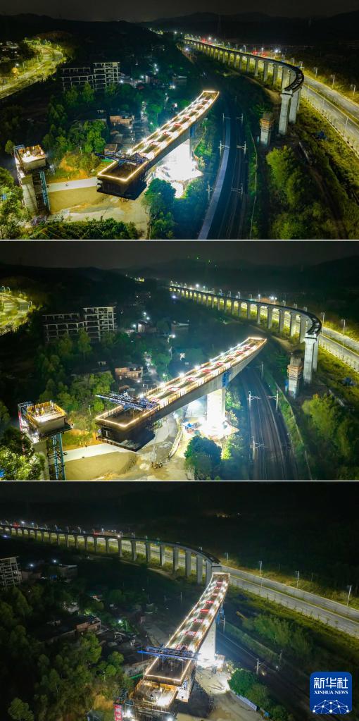 拼版照片:清遠(yuǎn)磁浮旅游專線長(zhǎng)隆特大橋跨京廣鐵路連續(xù)梁轉(zhuǎn)體過(guò)程(11月8日攝,無(wú)人機(jī)照片)。