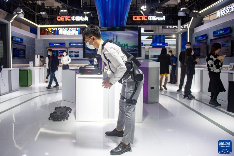 11月8日,中國(guó)電科工作人員為觀眾演示外骨骼機(jī)器人的使用。