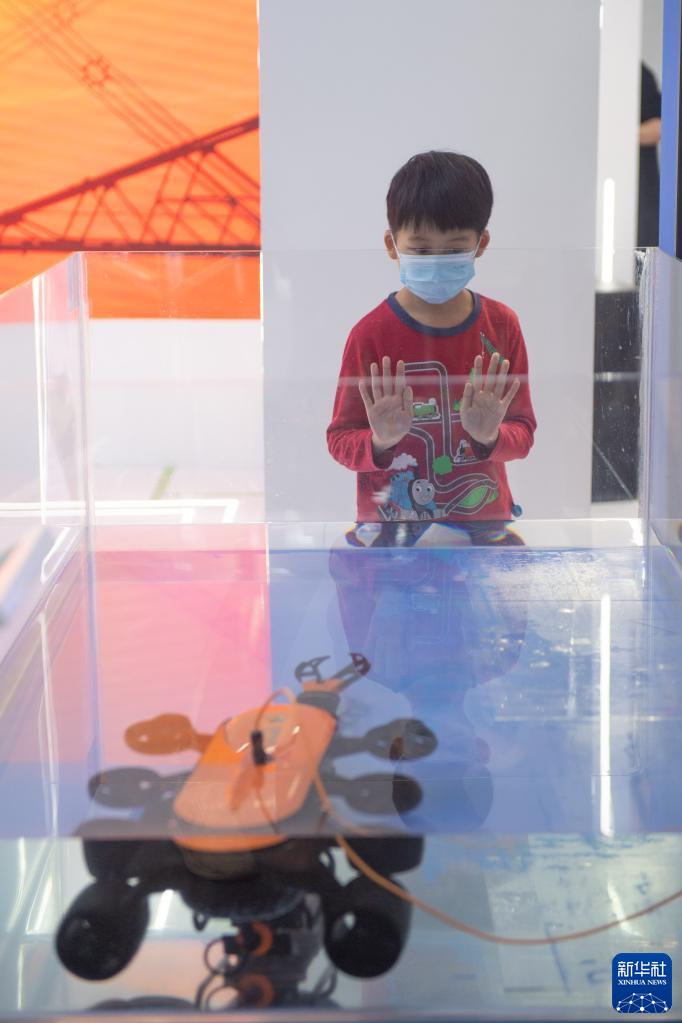 11月8日,小朋友在國(guó)家電網(wǎng)展臺(tái)參觀水下機(jī)器人。