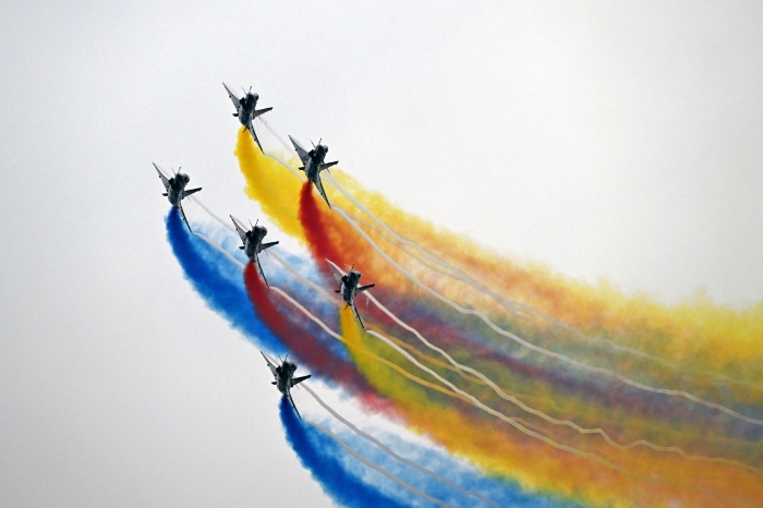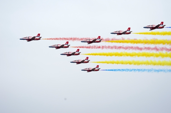 上午10時(shí),首先進(jìn)行飛行表演的是空軍八一飛行表演隊(duì),6架殲-10呈現(xiàn)了大仰角躍升、六機(jī)編隊(duì)斤斗、六機(jī)同步橫滾等動(dòng)作,不僅精彩震撼,同時(shí)也具備很高的實(shí)戰(zhàn)價(jià)值。作為空軍“學(xué)院派”飛行表演隊(duì)的空軍航空大學(xué)“紅鷹”飛行表演隊(duì),以“飛出驚險(xiǎn)、飛出極限、飛出震撼”而著稱。針對(duì)珠海的天氣與地域特點(diǎn),他們今年增加了八機(jī)通場(chǎng)、八機(jī)盤旋等動(dòng)作,表演更緊湊、更有看點(diǎn)。