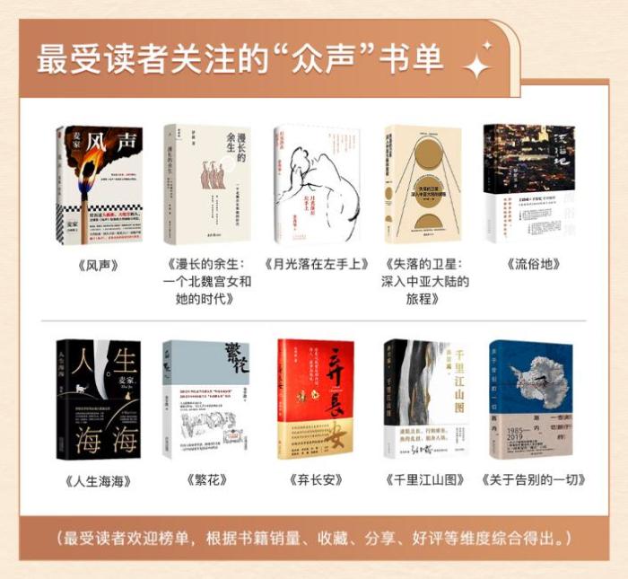 本次冬日書單還收錄了第四季“多多讀書月”里的眾聲書單。麥家的《風(fēng)聲》、孫甘露新作《千里江山圖》、李偉長所著閱讀隨筆集《未被摧毀的生活》及羅新的《漫長的余生:一個北魏宮女和她的時代》等作品悉數(shù)在列。