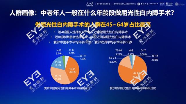從性別看,屈光性白內(nèi)障手術(shù)女性占比總體都略高于男性,中國為55.4%,歐洲為53.1%;從年齡層看,無論中歐,選擇屈光性白內(nèi)障手術(shù)患者的年齡層占比最高的都是45-64歲這一年齡段。CLINICA BAVIERA集團研發(fā)部總監(jiān)、醫(yī)療委員會委員Dr.Jaime Beltrán指出,在愛爾歐洲,近八成的患者在45-64歲做屈光性白內(nèi)障手術(shù)。中國的這一比例為38.84%,歐洲是中國的2倍。