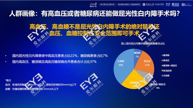 針對中老年人非常關(guān)注的高血壓、糖尿病患者能否做屈光性白內(nèi)障手術(shù)?《白皮書》也給出了答案。國內(nèi)高血壓、糖尿病、高血壓糖尿病合并的屈光性白內(nèi)障手術(shù)患者占比達37%。高血壓、高血糖不是屈光性白內(nèi)障手術(shù)的絕對禁忌證,當血壓、血糖控制在安全范圍內(nèi),經(jīng)醫(yī)生評估安全后可進行手術(shù)。
