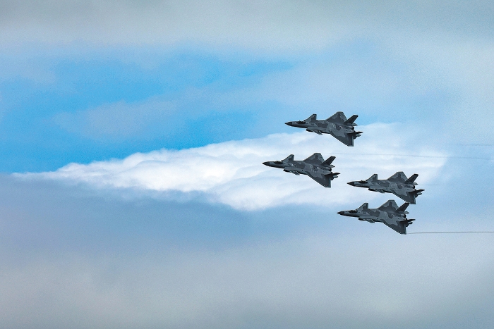 11月11日,殲-20戰(zhàn)機(jī)四機(jī)編隊(duì)在第十四屆中國(guó)航展上進(jìn)行飛行展示。新華社發(fā)