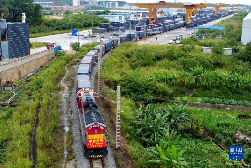 搭載2600噸白糖的中歐班列從南寧國際鐵路港出發(fā)駛向哈薩克斯坦阿拉木圖(2022年5月15日攝,無人機照片)。新華社記者 張愛林 攝
