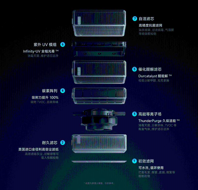 除此之外,采用7KG重的超級濾芯,七重復(fù)合凈化,從下到上,空氣依次通過可水洗循環(huán)利用的初效濾網(wǎng)、采用進(jìn)口金佰利高容塵濾紙的耐久濾芯、久續(xù)潔能的高能等離子場、吸附力提升100%的萬級碳素陣列、無需更換的催化醛解濾芯、紫外UV模組的全幅光幕、高精度抗菌濾網(wǎng)的自潔濾芯,經(jīng)過層層凈化,多種空氣污染一舉拿下。