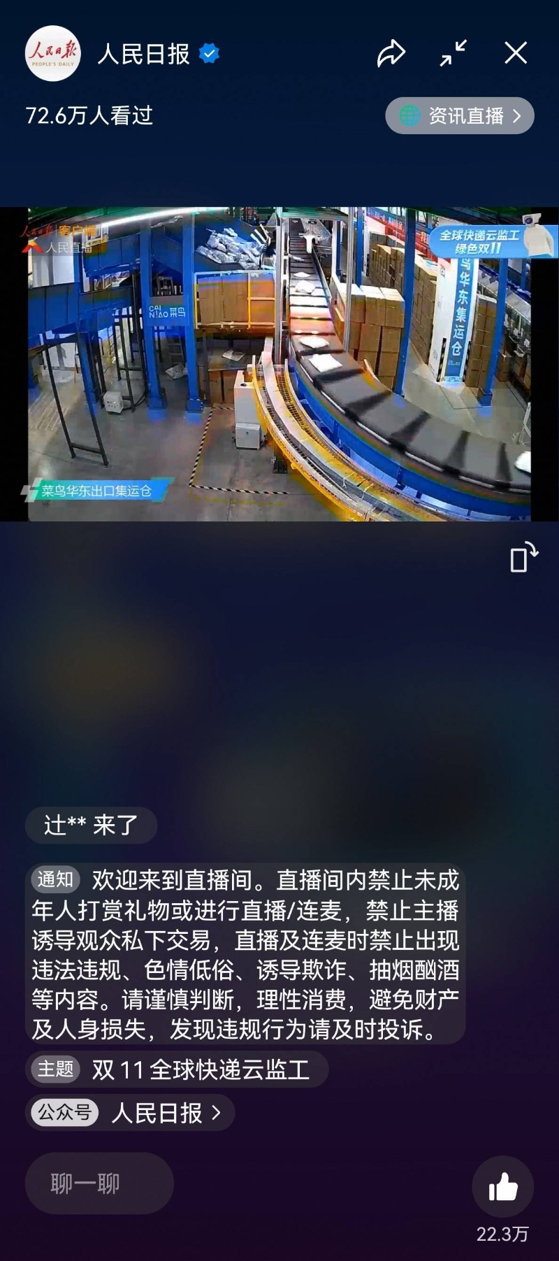 “快遞小哥治好了我的精神內(nèi)耗?!?1月12日零點(diǎn),伴隨著第14屆天貓雙11收官,一場超11天共268小時(shí)的全球快遞“云監(jiān)工”直播也正式落幕。從10月31日晚八點(diǎn)開播以來,這場“治愈系直播”已被全國70多家媒體轉(zhuǎn)播,僅視頻號(hào)和抖音號(hào)就吸引了超3000萬人次圍觀。