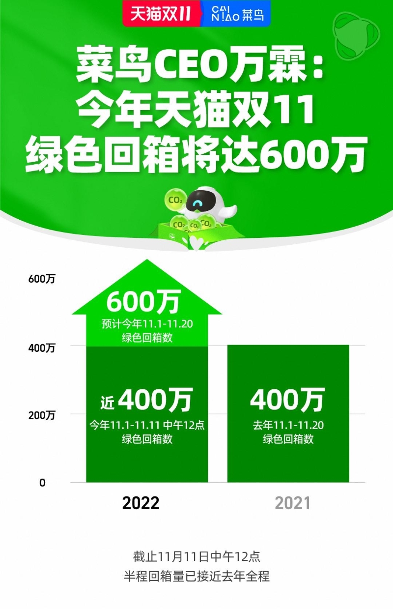 天貓雙11綠色參與量再創(chuàng)新高。今天(11月11日)下午,菜鳥CEO萬(wàn)霖表示,今年雙11物流運(yùn)行到半程時(shí)的回箱量就已接近去年全程,整個(gè)雙11物流全周期的綠色回箱數(shù)將達(dá)到600萬(wàn)個(gè),相較去年增長(zhǎng)50%。