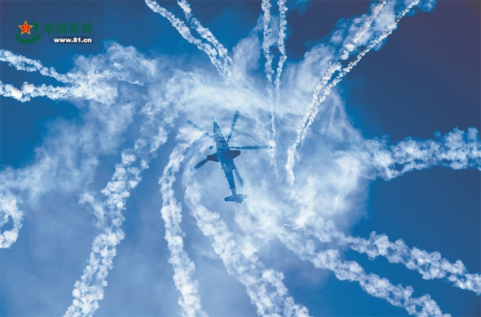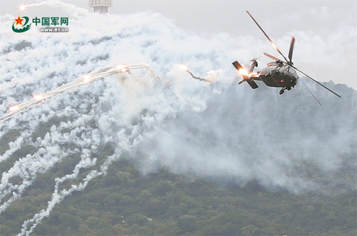 陸軍某空中突擊旅直-20飛機(jī)釋放干擾彈。