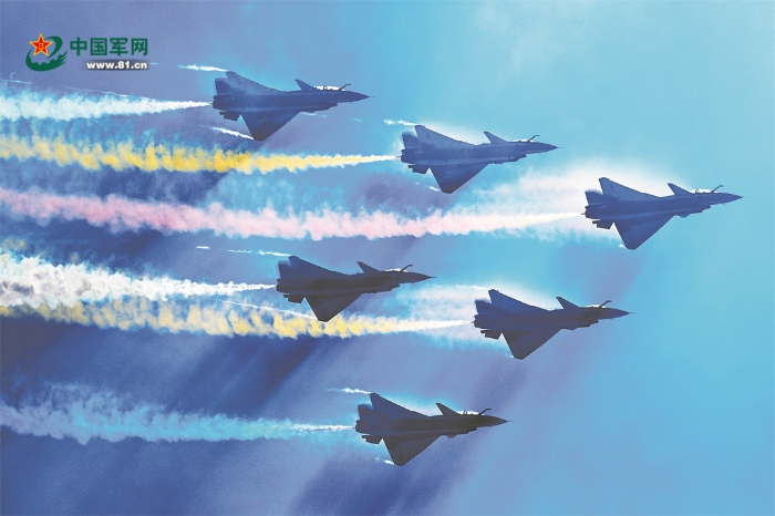 空軍八一飛行表演隊(duì)六機(jī)編隊(duì)進(jìn)行飛行表演。