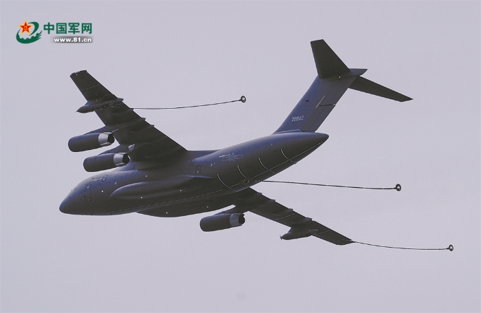 空軍運(yùn)油-20飛機(jī)釋放出3根油管進(jìn)行飛行表演。
