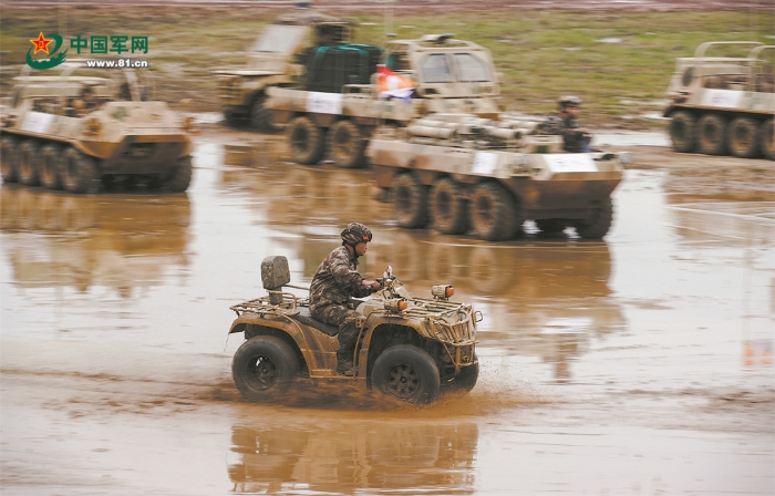 地面動(dòng)態(tài)演示現(xiàn)場(chǎng),山貓全地形車通過積水泥濘路面。