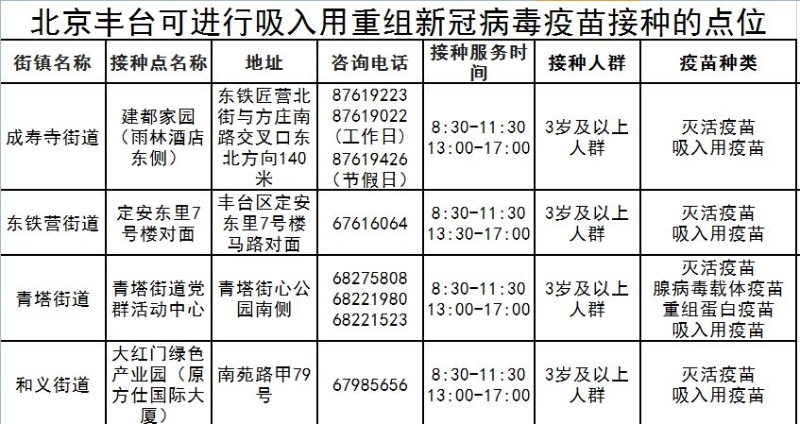 11月14日,豐臺區(qū)衛(wèi)健委發(fā)布消息稱,豐臺區(qū)目前可進(jìn)行吸入用重組新冠病毒疫苗接種的點(diǎn)位有成壽寺街道、東鐵匠營街道、青塔街道、和義街道。