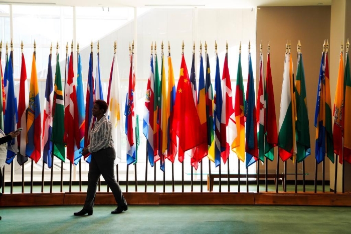 2021年10月20日,一名女子從紐約聯(lián)合國總部聯(lián)大會堂外的國旗展示區(qū)經(jīng)過。新華社記者王迎攝