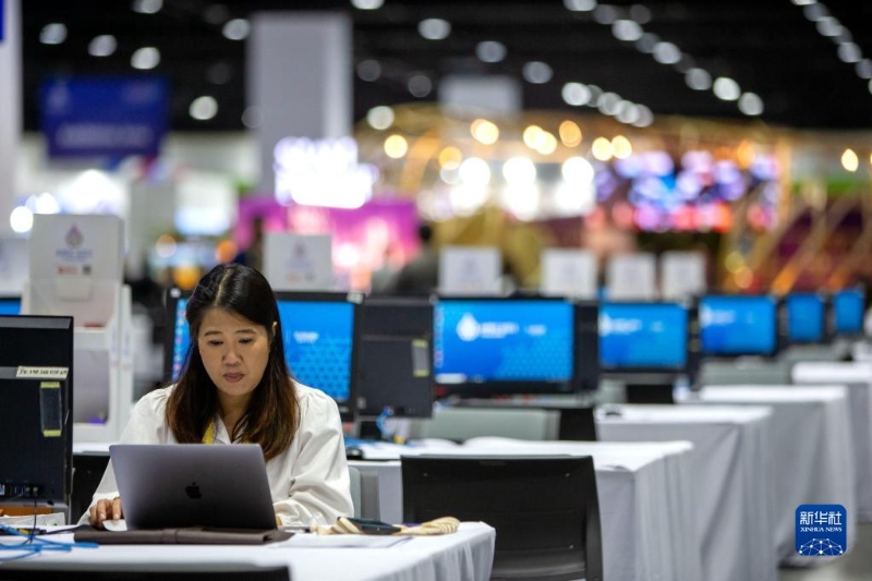 11月14日,在泰國(guó)首都曼谷,工作人員在APEC會(huì)議媒體中心工作。
