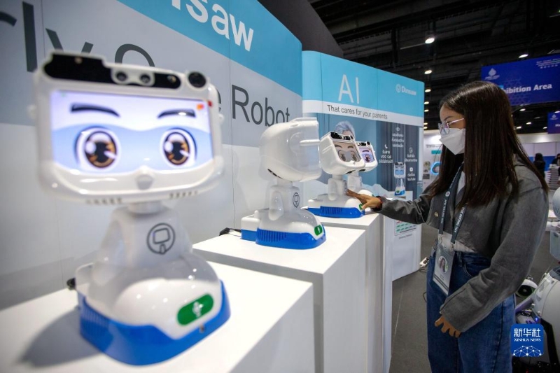 11月14日,在泰國(guó)首都曼谷,工作人員在APEC會(huì)議媒體中心與機(jī)器人互動(dòng)。