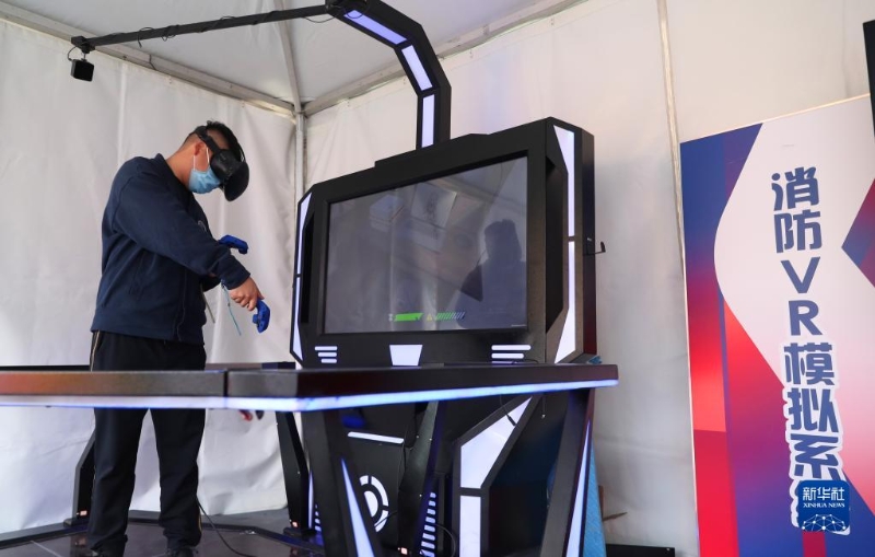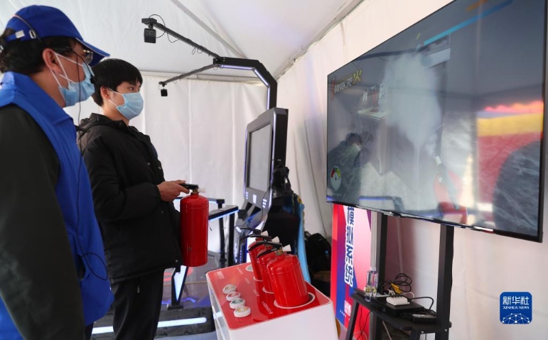 11月15日,在虹口區(qū)消防救援支隊舉行的宣傳活動中,社區(qū)居民通過消防VR模擬系統(tǒng)體驗排除火災(zāi)隱患的游戲。