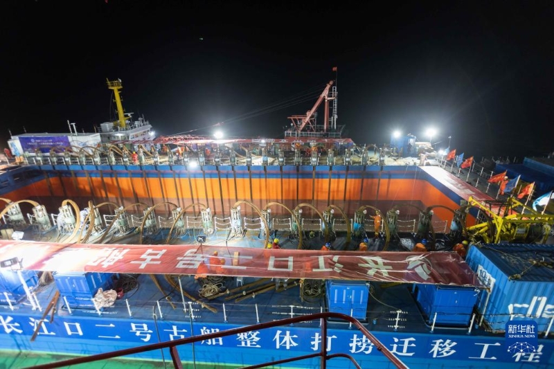 11月20日拍攝的長江口二號古船整體打撈出水施工現(xiàn)場。