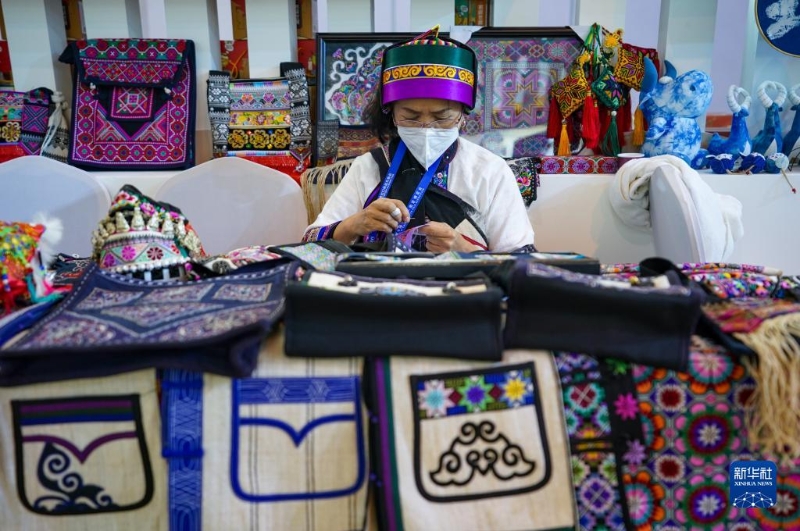 11月20日,一名參展商在南博會(huì)旅游文化館內(nèi)整理彝繡展品。