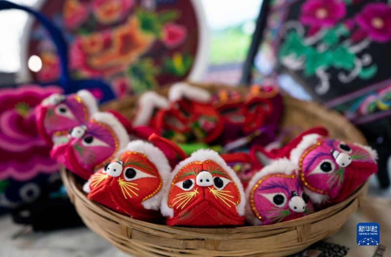 這是11月20日在南博會(huì)旅游文化館內(nèi)拍攝的彝繡虎頭鞋。