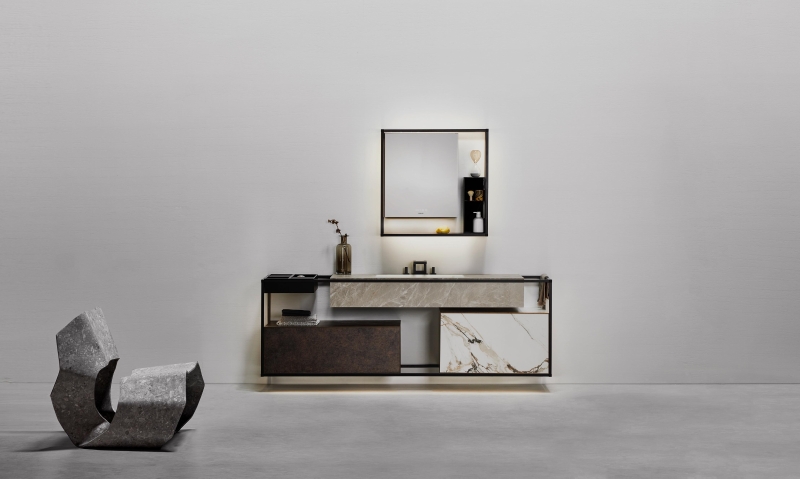 “一半藝術(shù),一半生活”是FAENZA法恩莎主張的品牌理念與品牌精神,與楊明潔的設(shè)計(jì)初衷是一種藝術(shù)上的契合。楊明潔強(qiáng)調(diào)的“數(shù)字存在主義”中的數(shù)字技術(shù),體現(xiàn)在FAENZA法恩莎標(biāo)準(zhǔn)化、模塊化的產(chǎn)品設(shè)計(jì)流程,形成統(tǒng)一的“藝術(shù)家族”感以及可持續(xù)發(fā)展的產(chǎn)品設(shè)計(jì)生態(tài)。例如“Mondrian”系列浴室柜以及羊舍“C型椅”的表面,可以看到不同的石材質(zhì)感,這其實(shí)是在不同的基材表面,通過數(shù)字化的加工工藝而實(shí)現(xiàn)的極其逼真的材料質(zhì)感,但并非是真實(shí)的材料。數(shù)字時(shí)代的制造工藝使得材料的創(chuàng)新與應(yīng)用可能性在產(chǎn)品品類之間的邊界正在消失。
