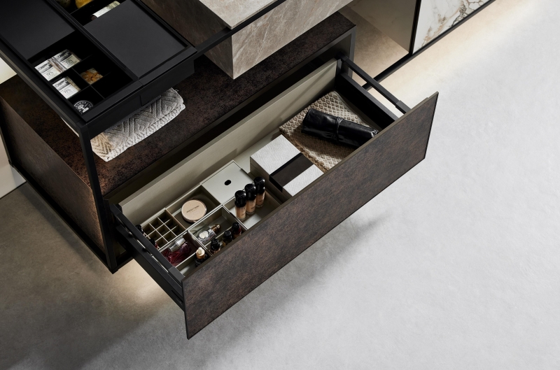 此款衛(wèi)浴系列新品,包括水龍頭和浴室柜在內(nèi),采用不同比例的體塊構(gòu)成與材質(zhì)搭配,巧妙融合于衛(wèi)浴空間,形成了視覺語言上的獨(dú)特性與差異化。在兼具美感的同時(shí),這樣的設(shè)計(jì)也創(chuàng)造了優(yōu)秀的用戶體驗(yàn):純粹垂直水平線條具有很好的引導(dǎo)性,讓產(chǎn)品的功能、使用方式,更加可視化。結(jié)構(gòu),造型、色彩進(jìn)行了合理分布,不同比例與材質(zhì)的體塊均衡分布,用于物品的儲(chǔ)存。體塊與框架之間形成的空間可以很好地放置使用頻率較高的物品。