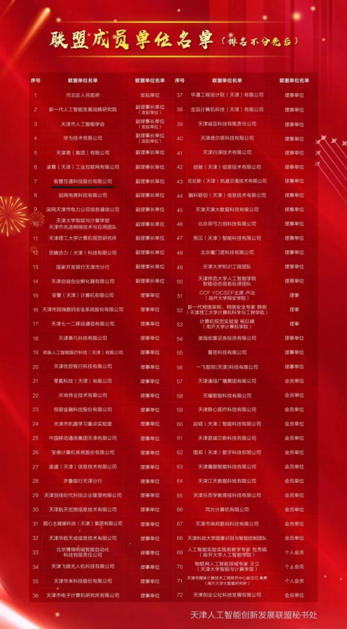 近日,天津人工智能創(chuàng)新發(fā)展聯(lián)盟首屆常務理事會成功召開,標志著創(chuàng)新發(fā)展聯(lián)盟正式成立。聯(lián)盟首批招募成員單位72家,其中,智慧互通科技股份有限公司單位擔任副理事長單位。