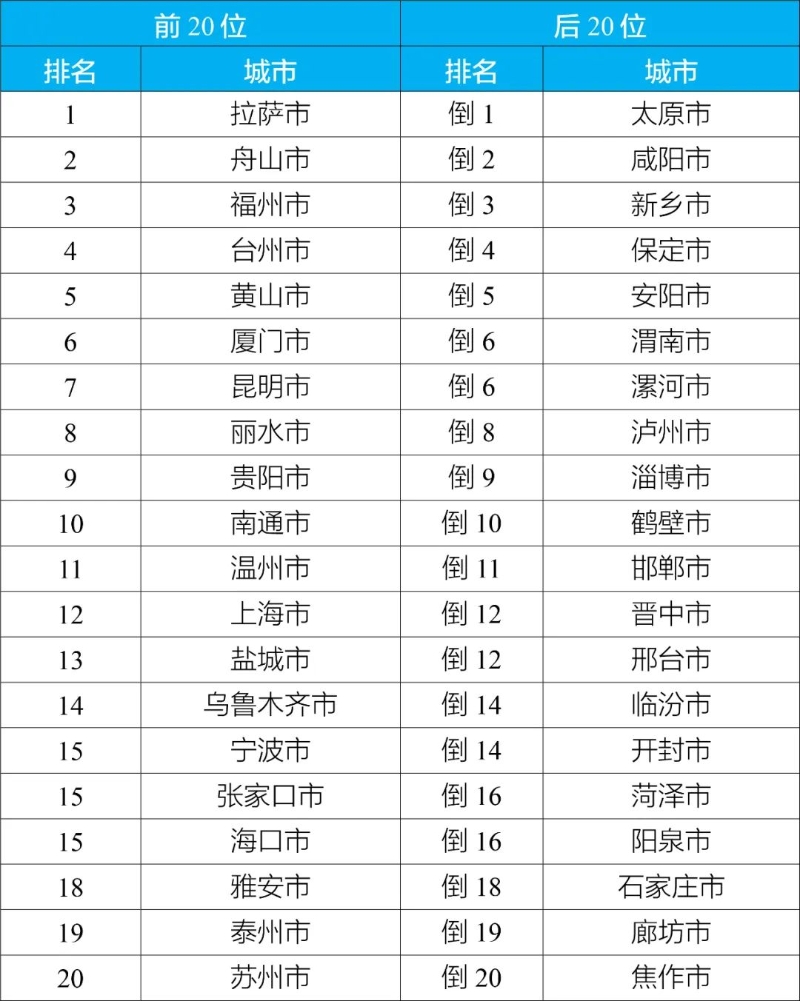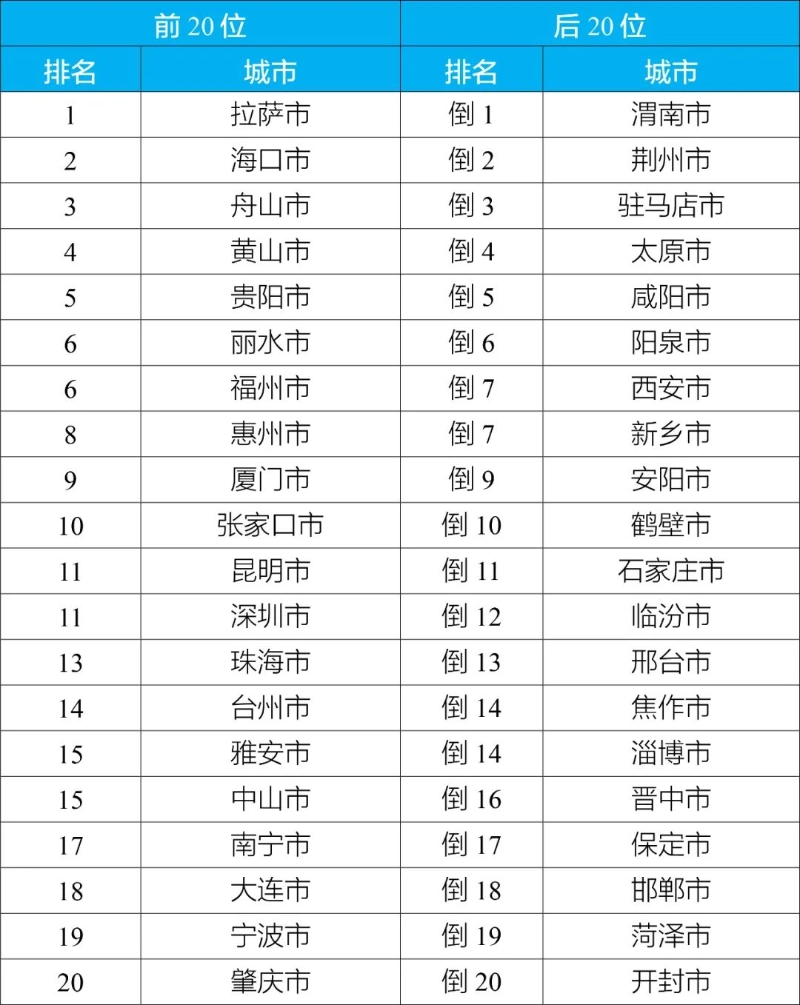 10月,168個(gè)重點(diǎn)城市中,拉薩、舟山和福州市等城市空氣質(zhì)量相對(duì)較好(從第1名至第20名);太原、咸陽和新鄉(xiāng)市等城市空氣質(zhì)量相對(duì)較差(從倒數(shù)第1名至倒數(shù)第20名),見附表1。