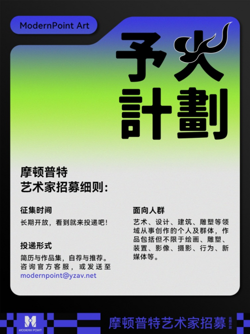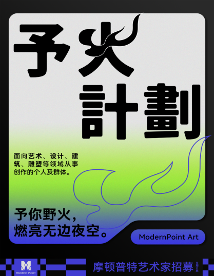通過「予火計劃」藝術家招募,Modern Point號召更多對藝術心懷熱情,尋找上升空間的藝術家、創(chuàng)作人、設計師加入我們。摩頓普特能創(chuàng)造更廣大的舞臺,為藝術創(chuàng)作者提供全面支持,助力每一位銳意突破的藝術創(chuàng)作者更好地成長、更專注于藝術創(chuàng)作、散發(fā)出更耀眼的光芒。