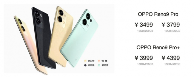 OPPO Reno9系列提供Reno9 Pro+、Reno9 Pro與Reno9三個(gè)版本。OPPO Reno9 Pro+提供明日金、皓月黑、碧海青三種配色,16GB+256GB版本售價(jià)3999元,16GB+512GB版本售價(jià)4399元;OPPO Reno9 Pro提供明日金、皓月黑、微醺三種配色,16GB+256GB版本售價(jià)3499元,16GB+512GB版本售價(jià)3799元;OPPO Reno9同樣提供明日金、皓月黑、微醺三種配色,8GB+256GB版本售價(jià)2499元,12GB+256GB版本售價(jià)2699元,12GB+512GB版本售價(jià)2999元。