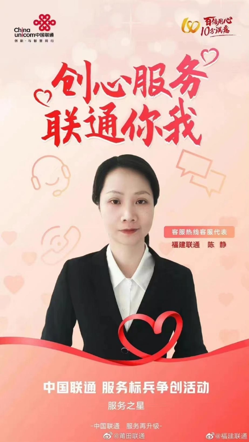 陳靜常說,服務無小事,細節(jié)暖人心。也許我們服務業(yè)績無法在“龍虎榜”上體現(xiàn),但我們可以做個服務有心人,從心出發(fā)做好服務,同樣可以在用戶心里扎根。就是這樣看似簡單的一件件小事,她卻始終用心去做、盡顯擔當。陳靜的默默付出得到公司的充分肯定,7次被公司授予莆田聯(lián)通“優(yōu)秀員工”等稱號,并因優(yōu)異的業(yè)績,成為今年首批全省“服務之星”榮譽稱號的獲得者,為團隊樹立了良好的標桿典范,營造了比學趕超的氛圍,激勵著團隊服務能力不斷提升。