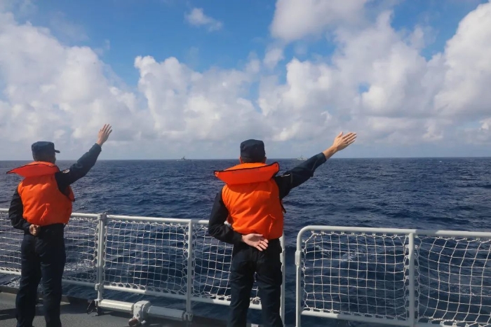 ▲11月25日,參加中越北部灣聯(lián)合巡邏的中方艦艇官兵向越方揮手告別。