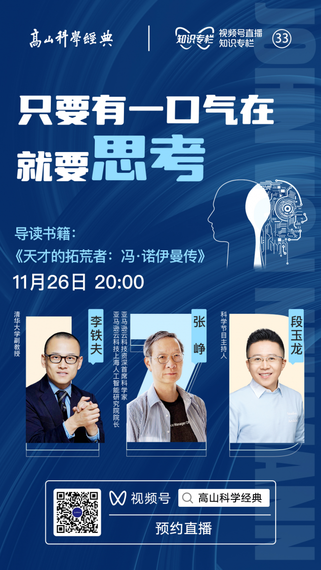 2022年11月26日晚八點,科普公益項目“高山科學經(jīng)典”邀請到了亞馬遜云科技資深首席科學家,亞馬遜云科技上海人工智能研究院院長張崢;清華大學副教授李鐵夫;科學節(jié)目主持人段玉龍,一起閱讀《天才的拓荒者:馮·諾伊曼傳》